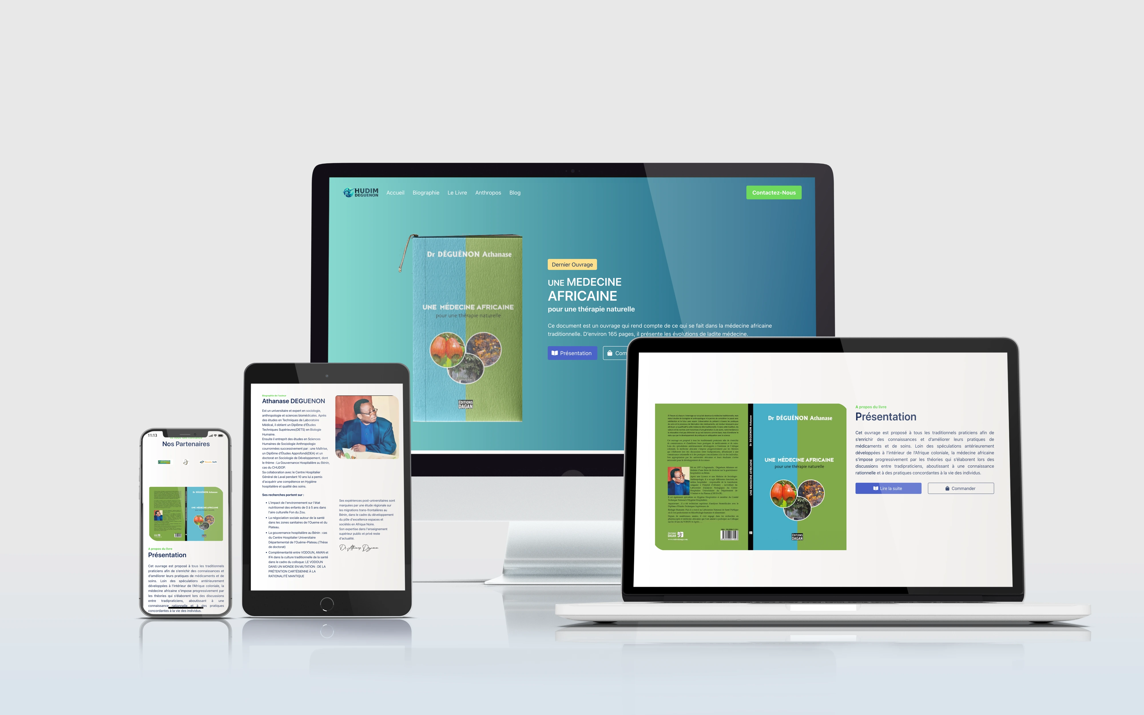 Le site HUDIM devait refléter la rigueur scientifique et la profondeur de la réflexion de l’auteur Athanase DEGUENON, tout en rendant accessible au grand public un ouvrage dédié à la médecine africaine traditionnelle. Le défi : traduire une expertise universitaire en une interface simple, éducative et visuellement engageante, afin de toucher à la fois les praticiens traditionnels, les étudiants et les lecteurs intéressés par l’anthropologie et la santé.